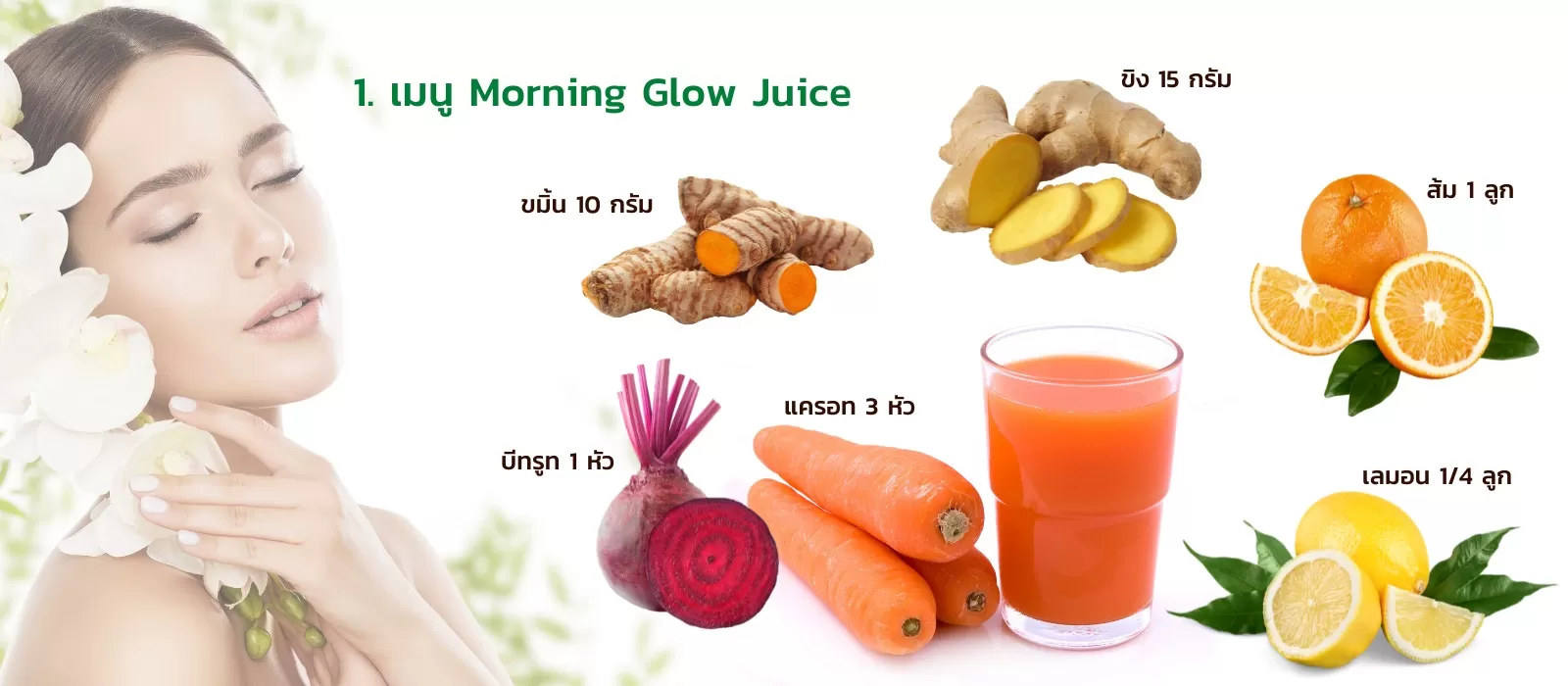 สำหรับเมนูแรกที่เราจะมาแนะนำทุกคนกันคือเมนู Morning Glow Juice เหมาะสำหรับคนที่อยากมีผิวพรรณเปล่งปลั่ง ผิวสวย และใสขึ้น เป็นตัวช่วยบำรุงผิวพรรณของคุณให้ดูเปล่งปลั่ง อ่อนเยาว์ มีส่วนช่วยในการบำรุงดวงตา ชะลอการเกิดริ้วรอย