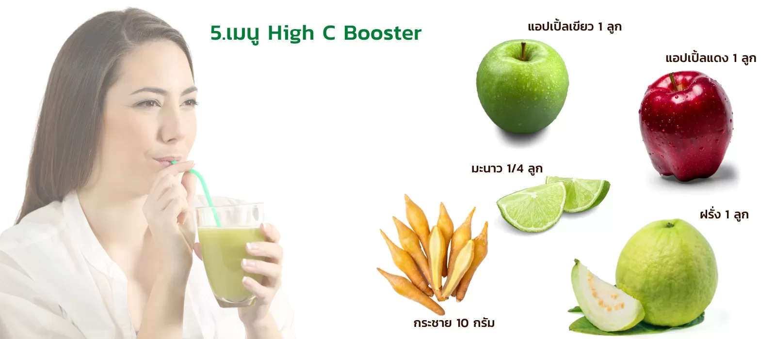 ลดความมัน ชะลอการเกิดริ้วลอยและสิว อีกทั้งยังช่วยเสิรมสร้างภูมิคุ้มกันของร่างกายด้วย ซึ่งสูตรนี้ส่วนผสมหลักของเมนูเป็นการรวมตัวของแอปเปิลเขียว แอปเปิลแดง มะนาว ฝรั่ง และกระชาย ที่หาง่าย ๆ เอามาทำได้เลย