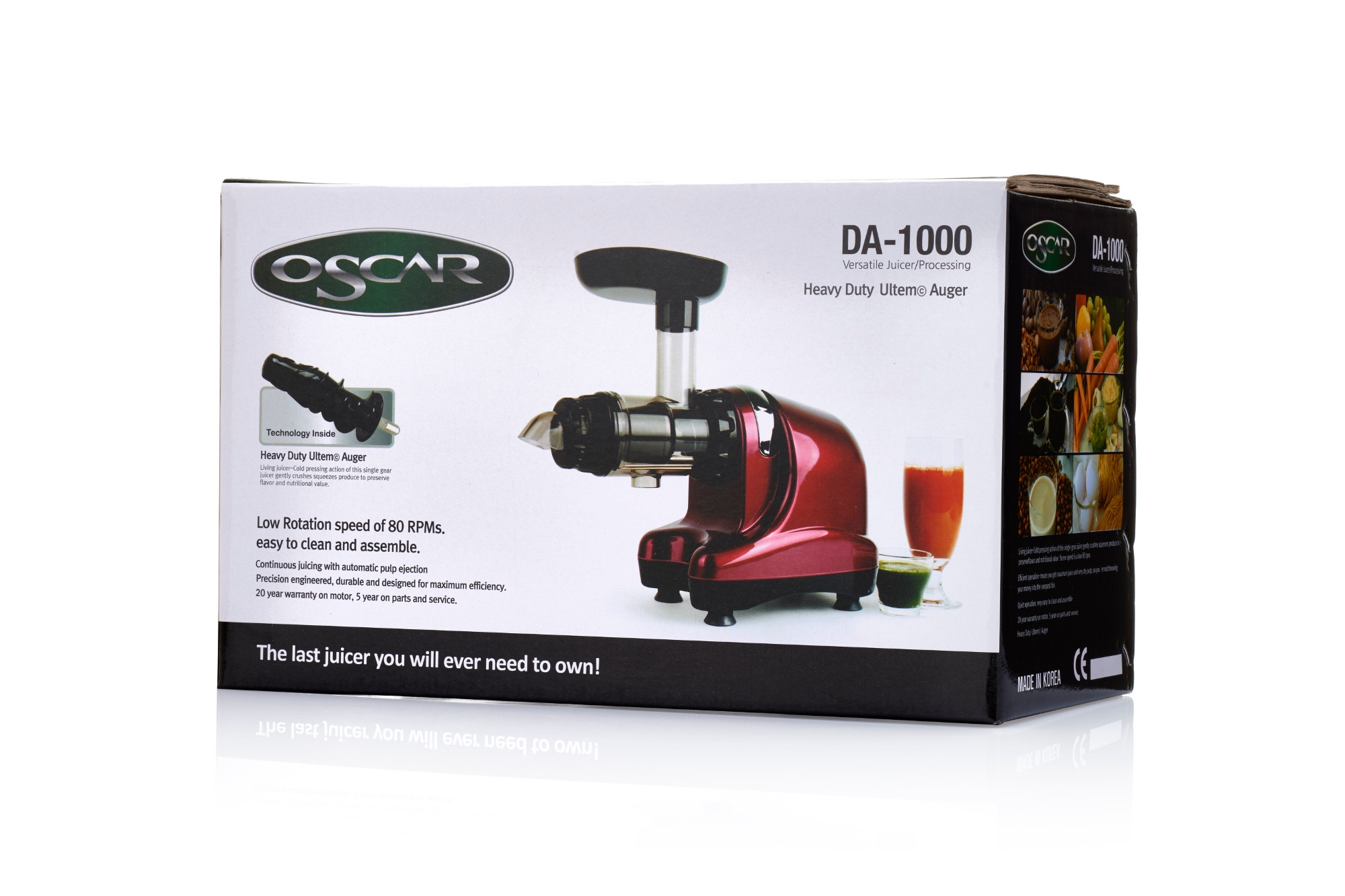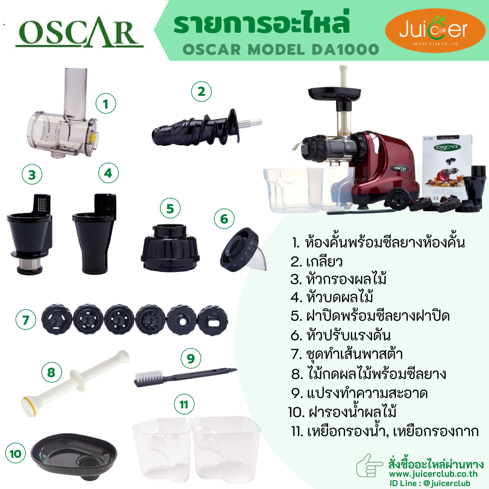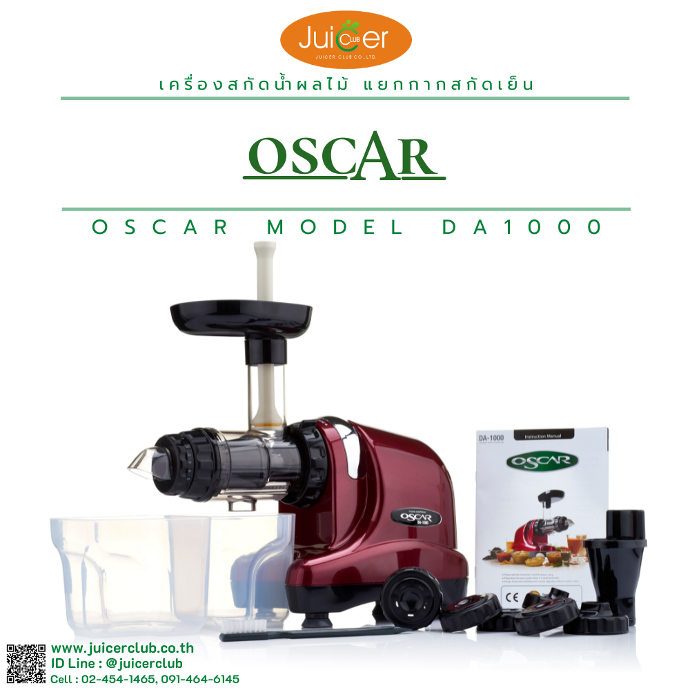 เครื่องสกัดน้ำผักผลไม้แยกกากชนิดสกัดเย็น Oscar DA1000 ระบบเกลียวเดี่ยวแนวนอน รอบต่ำเพื่อสุขภาพ รุ่น Classic ที่ได้รับความนิยมมาอย่างต่อเนื่องยาวนานในกลุ่มผู้รักสุขภาพ เหมาะสำหรับสกัดคั้นผักทีมีเส้นใยเหนียว-ไม่เหนียว สมุนไพร เช่น ใบย่านาง ต้นอ่อนข้าวสาลี กระชาย ขิง ฯลฯ และผลไม้ที่เนื้อแข็งปานกลาง-เนื้อแข็ง เช่น แอปเปิ้ลเขียว ฝรั่ง เป็นต้น
