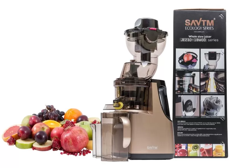 เครื่องสกัดน้ำผลไม้ Savtm JE230-18M00 ระบบเกลียวเดี่ยวแนวตั้ง รอบต่ำที่สุดเพียง 33 รอบ/นาที ช่องใส่ผักผลไม้กว้าง สามารถใส่แอปเปิ้ลได้ทั้งลูก สามารถคั้นผักใบที่เส้นไม่เหนียวได้ดี และ ผลไม้ทั่ว ๆ ไปได้ สามารถทำน้ำนมข้าวโพด น้ำนมถั่วเหลือ น้ำนมอัลมอนด์ได้ อุปกรณ์ต่าง ๆ มีมาให้อย่างครบถ้วน ถ้าในระดับราคาไม่เกิน 10,000 บาท เครื่องนี้ถือว่าคุ้มค่าที่สุด